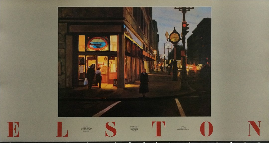 We scheduled my first show, and I began producing the work for it. One piece was a large, late evening urban landscape of Elliott Bay Book Company, and we persuaded its owner, Walter Carr, to publish a poster for the show. As the opening date neared I negotiated with some Jazz musician friends to play at the opening. These included John Bishop on drums, Chuck Deardorf on bass and Dave Peterson on guitar (a later lineup included Hans Teuber on sax.) These were some of the leading lights of the Seattle Jazz scene. The opening was packed, and really exposed a hunger for representational work within the audience for contemporary art in Seattle. As mentioned before, the work sold very well, and many works found a place in the homes of several important Pacific Northwest collectors.